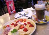 その後、TESCOでばらまき用お菓子のお土産を購入し、再びcafe『SLUVIA』へ。←すっかりお気に入り。今回は、“coconats coffee”と“Slavia pancake 〜ブルーベリー何たら…”(※左写真)を頼んでみる。coconats coffeeとやらは、コーヒーの中にココナッツの粒々が入っていて不思議な触感!パンケーキは、こちらもボリューミー!パンケーキっていうから、ホットケーキみたいのかと思ったら、要するにクレープだった(笑)。甘あま・ウマウマ♪ 「お会計お願いします」のチェコ語「プラチット、プロスィーム」を使ってみたら、ウェイターさんに通じて、何だか嬉しい〜い(^▽^)。 |